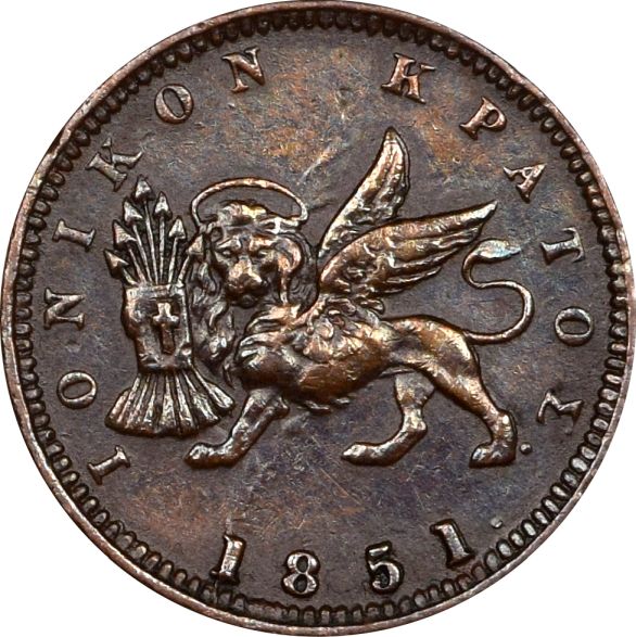 Ελλάδα Νόμισμα Ιονικό Κράτος 1 Λεπτό 1851. Η γνησιότητα όλων των νομισμάτων μας είναι εγγυημένη εφ όρου ζωής ενώ τυχόν ιδιαιτερότητες – ελαττώματα περιγράφονται αναλυτικά εφόσον υπάρχουν. (Κωδ. 10226)