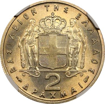 Ελλάδα Νόμισμα Παύλος 2 Δραχμές 1954 NGC MS66. Η γνησιότητα όλων των προϊόντων μας είναι εγγυημένη εφ όρου ζωής ενώ τυχόν ιδιαιτερότητες – ελαττώματα περιγράφονται αναλυτικά εφόσον υπάρχουν. (Κωδ. 9790)