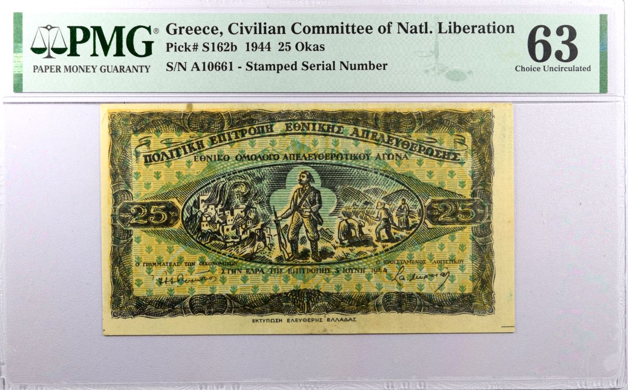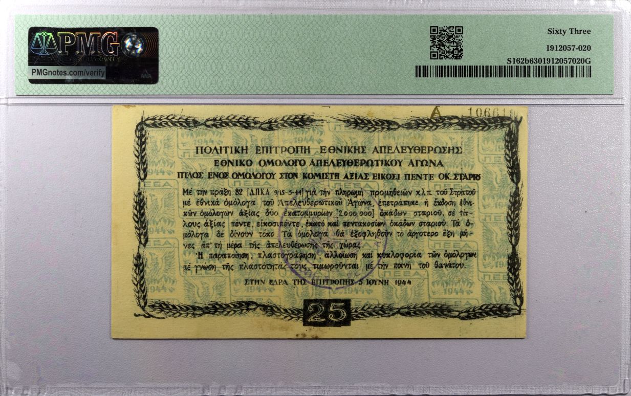 Επιτροπή Εθνικής Απελευθέρωσης 25 Οκάδες 1944 PMG63 Choice Uncirculated. Η γνησιότητα όλων των προϊόντων μας είναι εγγυημένη εφ όρου ζωής ενώ τυχόν ιδιαιτερότητες – ελαττώματα περιγράφονται αναλυτικά εφόσον υπάρχουν. (Κωδ. 10243)