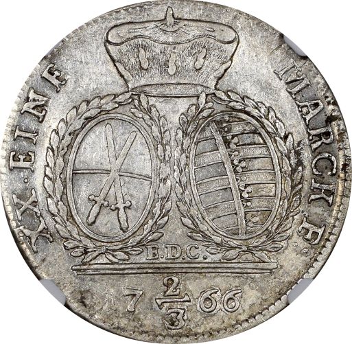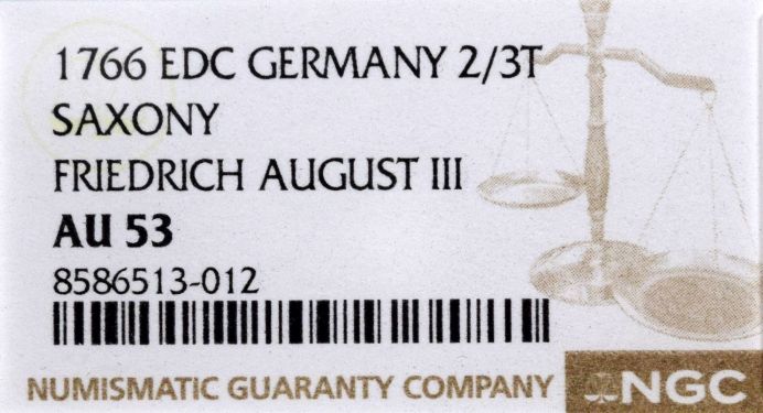 Γερμανία Germany 2/3 Thaler 1766 Silver Saxony Friedrich August III NGC AU53. Η γνησιότητα όλων των προϊόντων μας είναι εγγυημένη εφ όρου ζωής ενώ τυχόν ιδιαιτερότητες – ελαττώματα περιγράφονται αναλυτικά εφόσον υπάρχουν. (Κωδ. 10268)