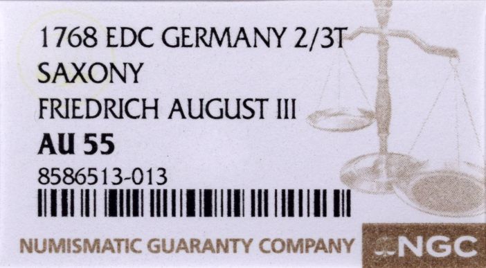 Γερμανία Germany 2/3 Thaler 1768 Silver Saxony Friedrich August III NGC AU55. Η γνησιότητα όλων των προϊόντων μας είναι εγγυημένη εφ όρου ζωής ενώ τυχόν ιδιαιτερότητες – ελαττώματα περιγράφονται αναλυτικά εφόσον υπάρχουν. (Κωδ. 10269)