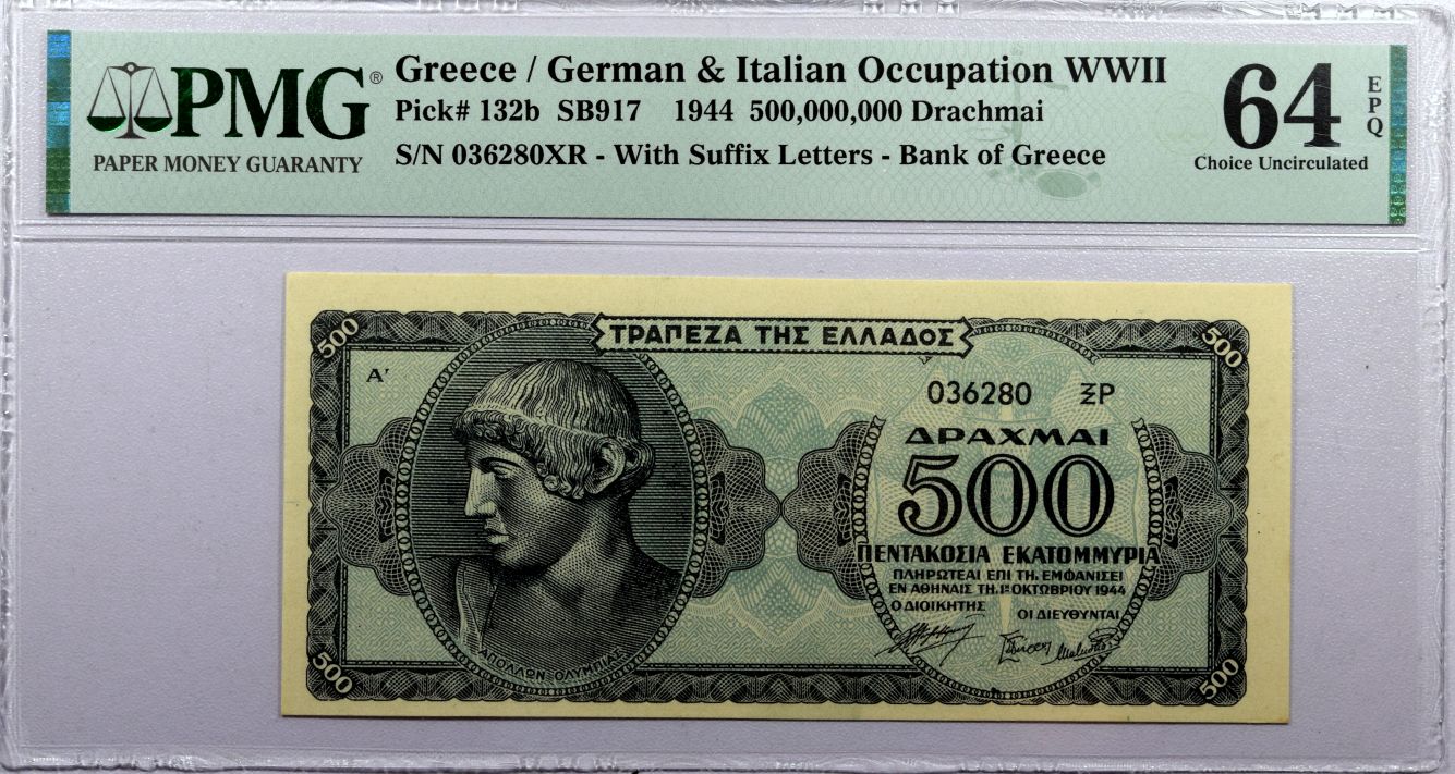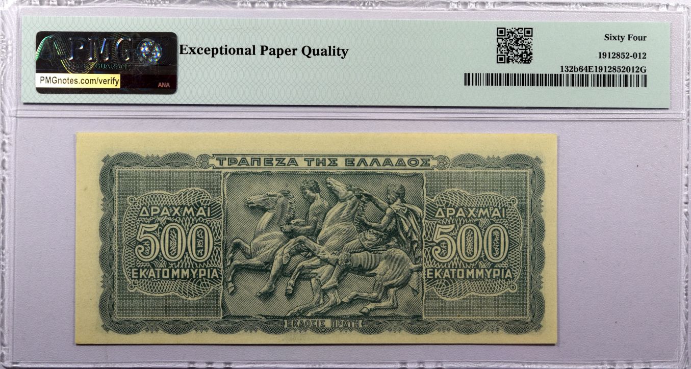 Τράπεζα Της Ελλάδος Χαρτονόμισμα 500 Εκατομμύριο Δραχμές 1944 PMG 64 EPQ. Η γνησιότητα όλων των νομισμάτων μας είναι εγγυημένη εφ όρου ζωής ενώ τυχών ιδιαιτερότητες – ελαττώματα περιγράφονται αναλυτικά εφόσον υπάρχουν. (Κωδ. 10254)